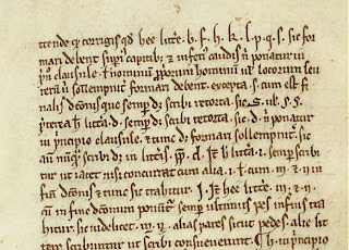 The second piece, although acephalous and only in four leaves, is the nearest to my heart: it’s a paleography manual! –with handy little bits of instruction, such as “S cum est finalis dictionis que semper debet scribi retorta, sic [s] vel [s], [s]” showing the various ways of shaping the letter S when it’s at the end of a word.