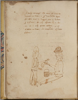Today, in to look at medieval manuscripts, I had a great group of 7th graders from a local school: enthusiastic kids, smart, engaging, who made the leap from the early materials they were looking at to their own education in a flash. They looked at a 13th century sale receipt for a slave and a papal bull of the same date; they read the opening words of a 15th century English primer, “Fadir owre that art in hevenes . . . “; they admired the alphabets in a 16th century calligraphy manual. In spite of the odd shape of medieval arabic numerals, they recognized a multiplication table in a copy of Boethius.They compared a bookmark image of the spheres of the heavens to the manuscript source of the image, and learned the lesson: the real thing is always the best. But what astonished me was their clear and favorite choice: an ordinary paper manuscript, Italian, 15th century, of word problems, meant for the children in the “abbaco” schools to study commercial arithmetic. Our 7th grade visitors recognized problems, read numbers, and sometimes gave answers! And the hokier the drawing, the more they exclaimed over the book. Top choice? See the picture; it’s about a father who has three sons, and to the oldest he gives 50 eggs, and to the middle son, 30 eggs, and the youngest receives 10 eggs; the sons go to market and sell most of each son’s eggs at the same price, with different pricing on some of their eggs; each son returns home with the same amount of money. What was the shared price of each egg? What was the price that each son put on his leftover eggs? And how much money did they bring home?